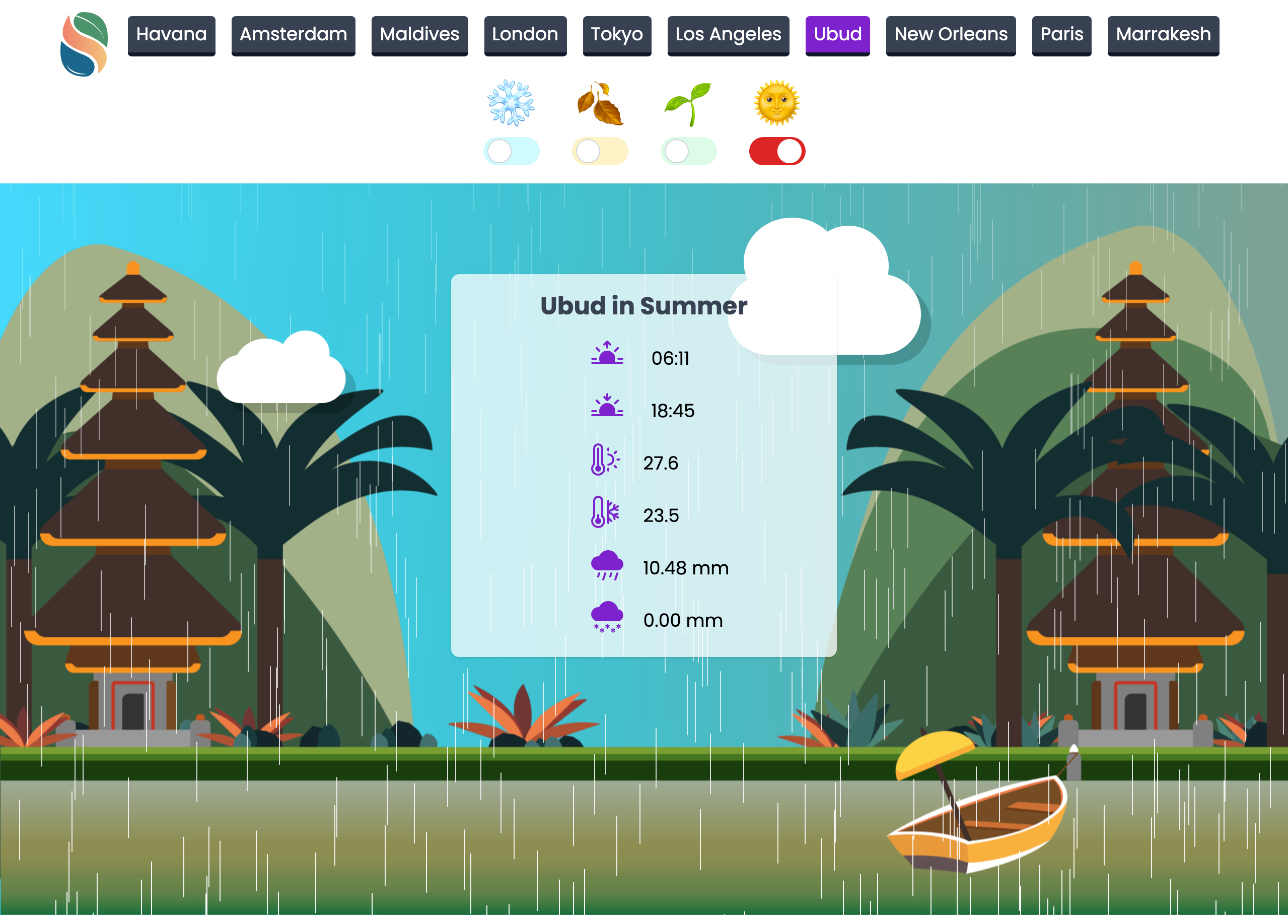 Built using HTML, TailwindCSS and Javascript and fetching data from the Open-Meteo and GeoApify APIs, Seasonall helps visitors see potential weather in key locations across the globe no matter the season. Using cute animations and custom illustrations of ten destinations from across the globe, Seasonall put all of JUX's experience to the test.