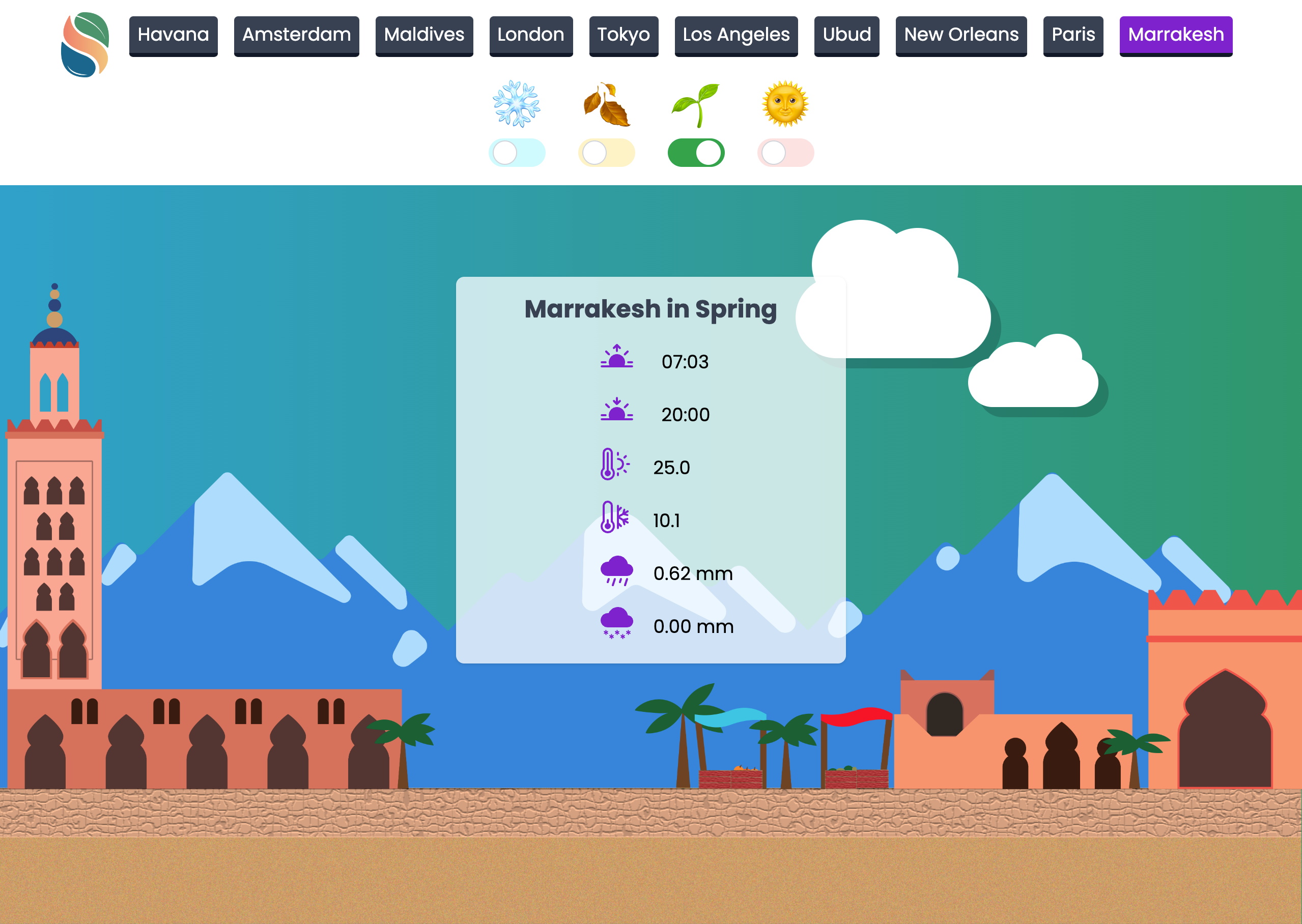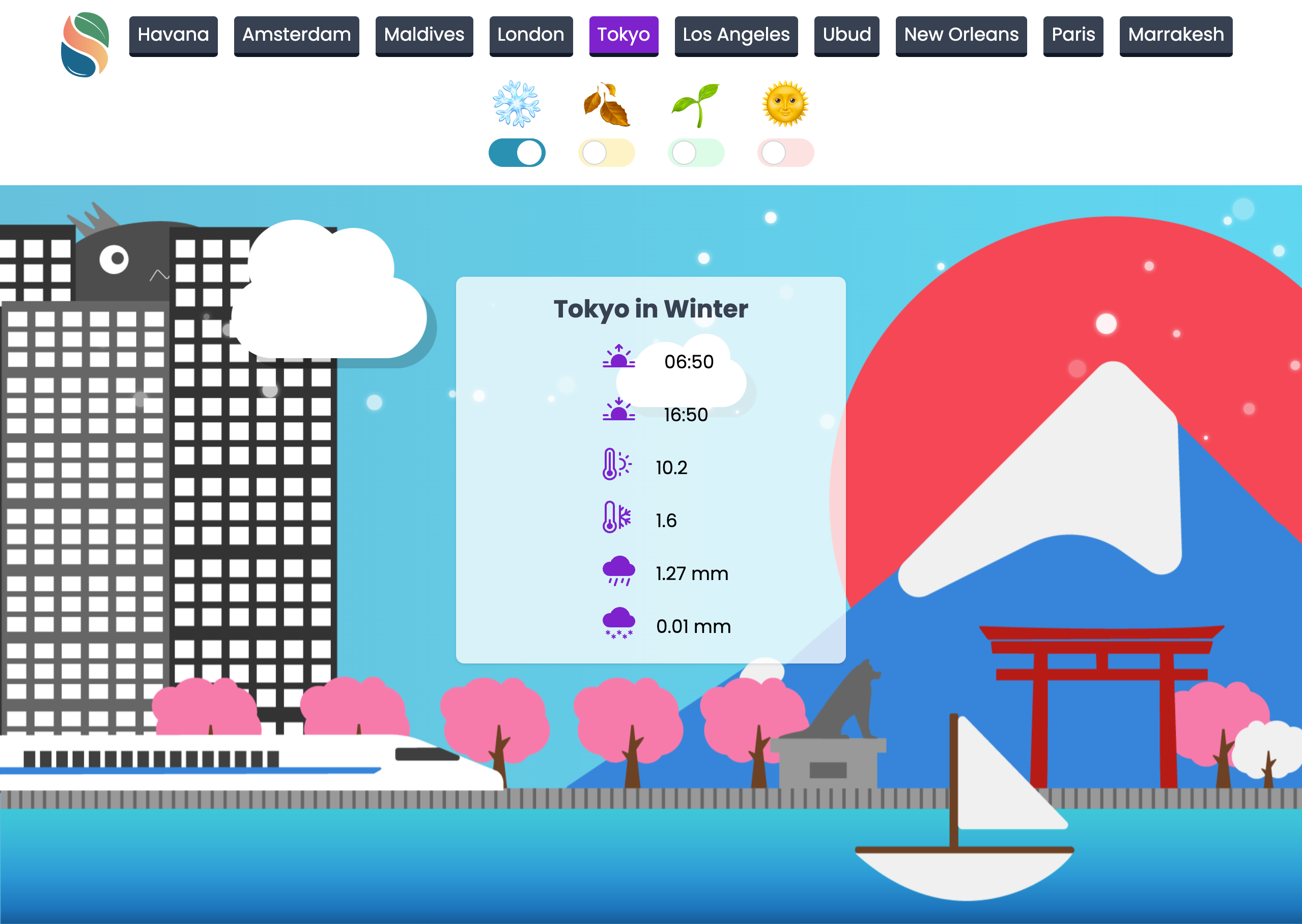 Built using HTML, TailwindCSS and Javascript and fetching data from the Open-Meteo and GeoApify APIs, Seasonall helps visitors see potential weather in key locations across the globe no matter the season. Using cute animations and custom illustrations of ten destinations from across the globe, Seasonall put all of JUX's experience to the test.